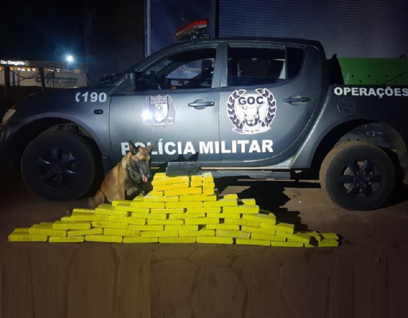 Durante a abordagem, o cão de faro de entorpecentes, Sniper, indicou que na cabine e no baú do caminhão continha indícios da presença das substâncias e após os policias realizarem uma busca minuciosa nos locais indicados, foram encontrados dois tabletes de substância semelhante à pasta base de cocaína e 100 tabletes de substância semelhante à maconha.