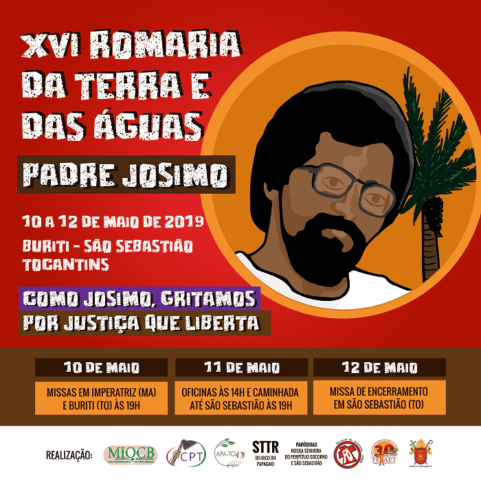 A tradicional Romaria da Terra e das Águas Padre Josimo chega à sua 16ª edição neste ano de 2019. Sob o lema “Como Josimo, gritamos por justiça que liberta!”, ecoando o apela da Campanha da Fraternidade, romeiros e romeiras celebrarão a memória insurgente dos mártires da caminhada camponesa, nos dias 10, 11 e 12 de maio, em Buriti e São Sebastião, no Bico do Papagaio.