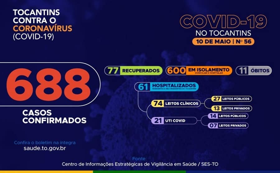 Atualmente, o Tocantins contabiliza 11 óbitos, 77 casos recuperados e 600 pacientes ainda em isolamento domiciliar ou hospitalar.