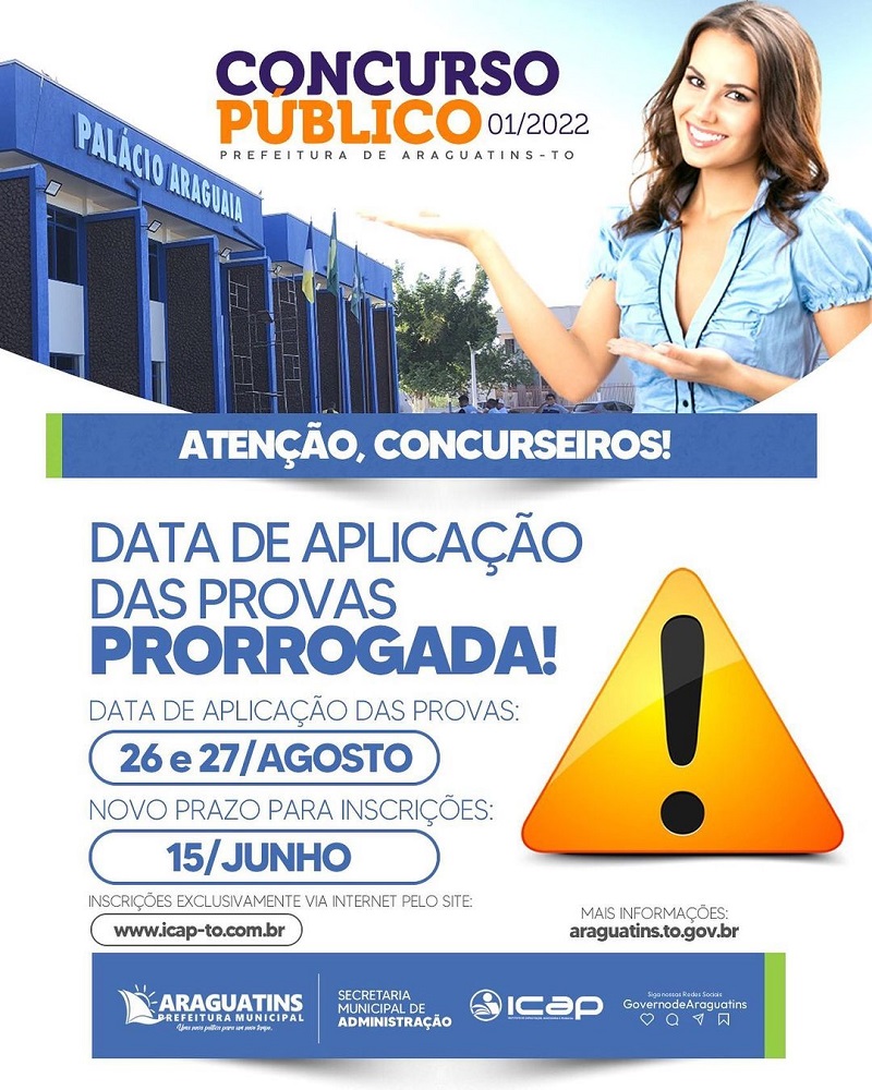 As inscrições no concurso da Prefeitura de Araguatins, no Bico do Papagaio, que oferece 162 vagas, foram prorrogadas. Os interessados podem se inscrever pelo site da organizadora do certame clicando AQUI.
