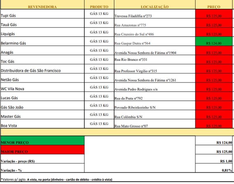 Em Tocantinópolis, os agentes pesquisaram 13 estabelecimentos. A variação apontada foi de 1%. O produto com o menor valor encontrado ficou na casa dos R$ 124,00 enquanto o mais caro, R$ 125,00.