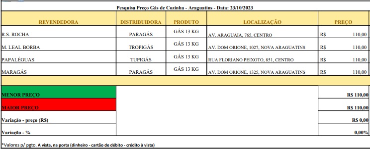 Em Araguatins os agentes pesquisaram quatro estabelecimentos. Em todos os estabelecimentos pesquisados, o valor encontrado foi de R$ 110,00. Variação de 0%.