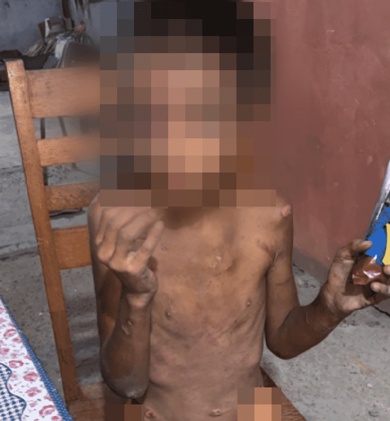 Muito assustada, chorando, ela conta que era agredida com chicote pelo casal onde ela morava e mostra as marcas das feridas nos braços,pernas, cabeça, rosto e até no olho. A situação absurda causou espanto nas pessoas que a socorreram, dado o nível de maus-tratos da garotinha.