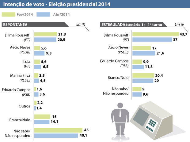 A segunda rodada neste ano da pesquisa encomendada pela Confederação Nacional do Trasporte CNT/MDA sobre a disputa eleitoral à Presidência da República, divulgada nesta terça-feira, 29, aponta avanço do senador Aécio Neves (PSDB), que subiu de 17 % nas intenções de voto em fevereiro para 21,6% em abril, em pesquisa de inteção de voto estimulada. No mesmo período, a presidente Dilma Rousseff (PT) caiu de 43,7% para 37%. Já Eduardo Campos (PSB) oscilou dentro da margem de erro e obteve 11,8% das intenções de voto, contra de 9,9% em levantamento feito no início do ano. O percentual dos eleitores que pretendem votar nulo ou em branco ficou estável, com leve queda de 20,4% para 20%.
