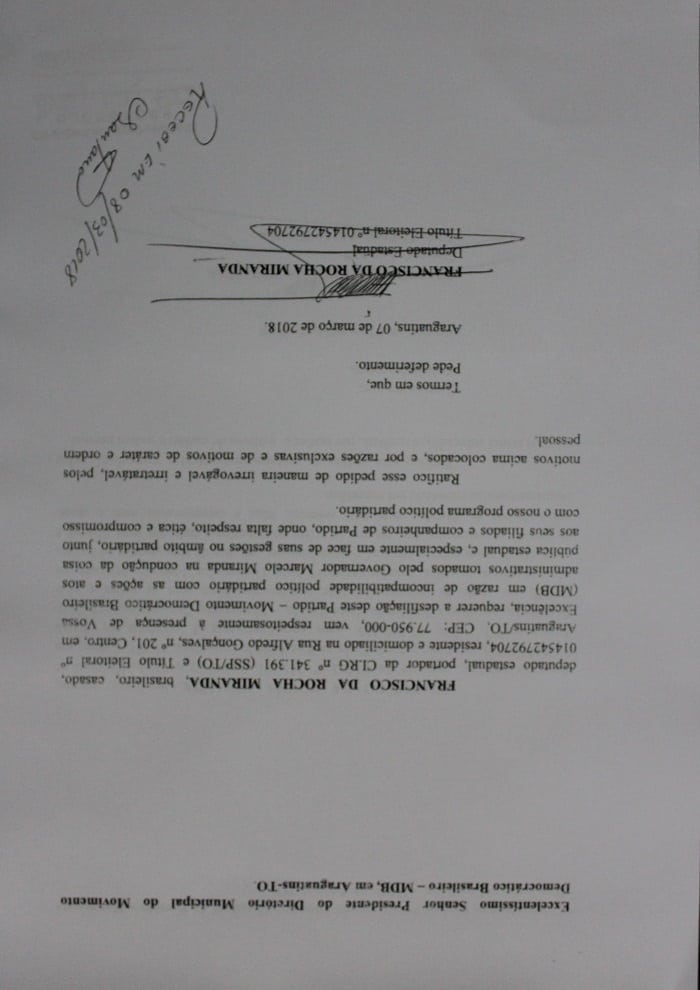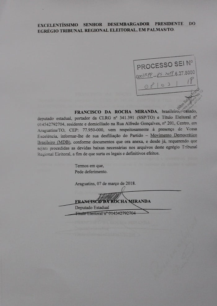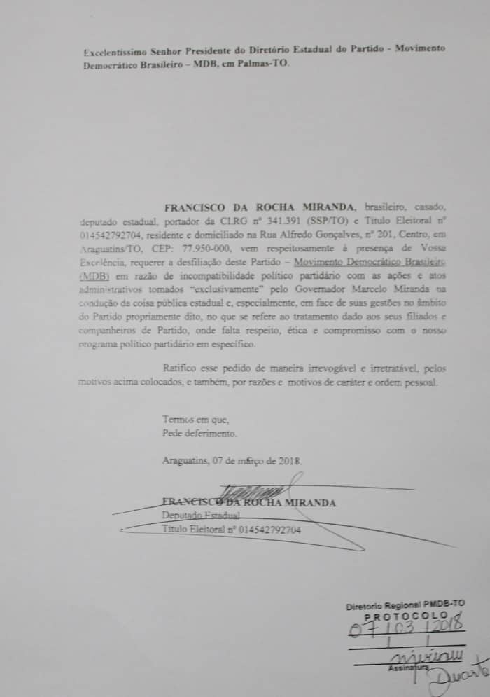 Rocha protocolou ainda na quarta-feira, 7, seu comunicado de desfiliação no Diretório Estadual da legenda e nesta quinta protocolizou no Diretório Municipal e Justiça Eleitoral.