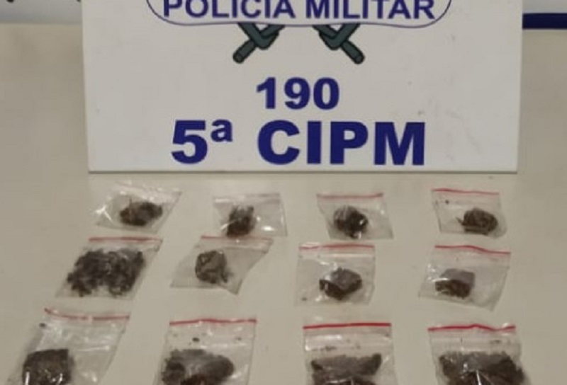 Os policiais militares realizavam patrulhamento de rotina quando suspeitaram da atitude do jovem, que estava em frente a uma casa lotérica, no centro da cidade e ao avistar a equipe policial colocou rapidamente no bolso do short um embrulho.