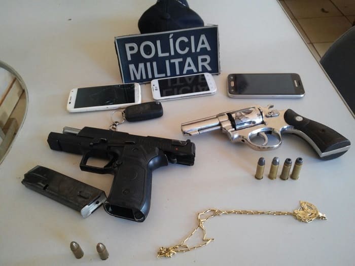 Com eles foram encontrados dois revólveres calibre 38 e uma pistola, além de R$ 175, um cordão de ouro e celulares roubados. O caso será encaminhado para a Polícia Federal de Araguaína.