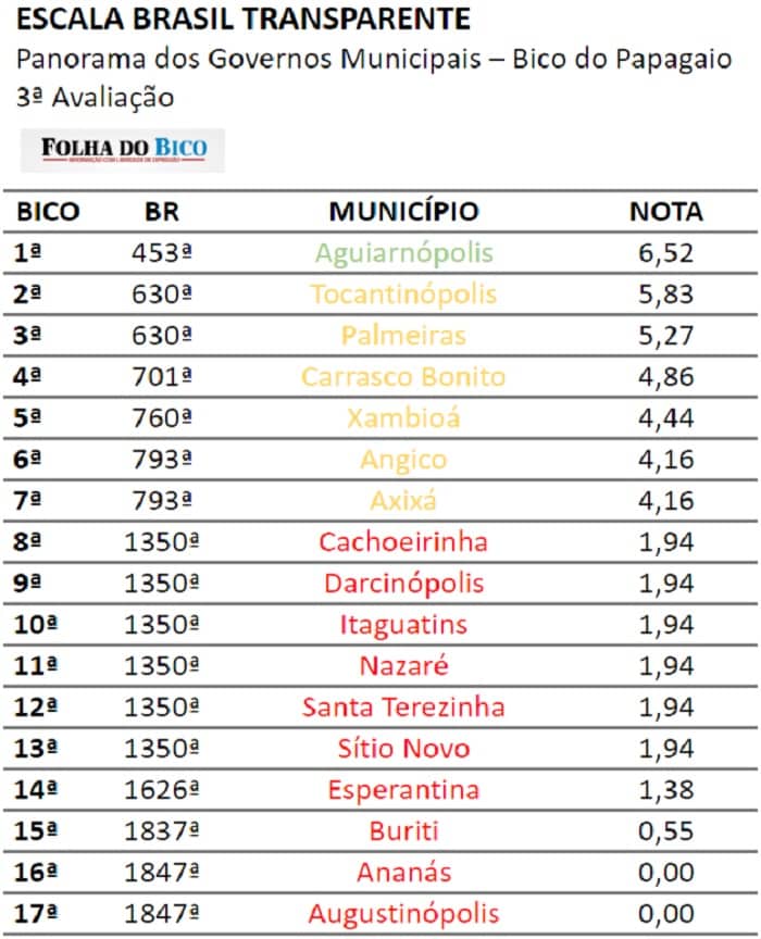 Na outra ponta, como piores municípios em transparência, Augustinópolis e Ananás. A diferença básica entre os dois piores é que Ananás já havia sido avaliada da 2ª edição, onde também tirou a nota zero.