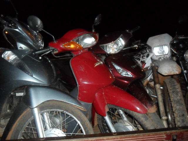 Em uma residência da cidade os policiais apreenderam uma Honda Biz C100 cor vermelha, placa MVV-2123, de Araguaína/TO; uma Yamaha XTZ 125 cor branca, placa MVW-6952, de Nova Olinda/TO; Uma Honda Biz C100 cor vermelha, placa MVW-0779, de Angico/TO e uma Honda Biz C125 cor prata, sem placa, chassi de número 9C2JC4820CR274788. Duas das referidas motos constavam como furtadas na Rede Infoseg.