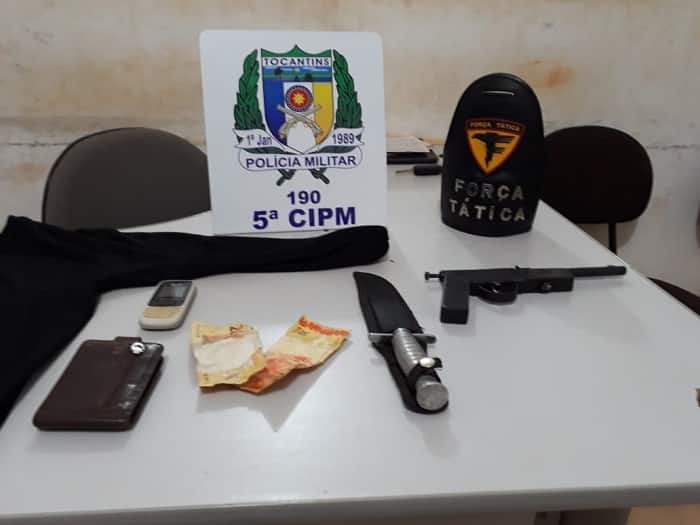 Dois indivíduos conduziam uma motocicleta, Honda CG, e foram abordados pelos militares ao apresentarem atitudes suspeitas. Após a ordem de parada, foi realizada busca pessoal, e os militares encontraram com um dos envolvidos uma arma de fogo, tipo “caseira” e uma arma branca. Com o condutor do veículo, a equipe apreendeu a quantia de R$ 40,00 reais em espécie e um aparelho celular.