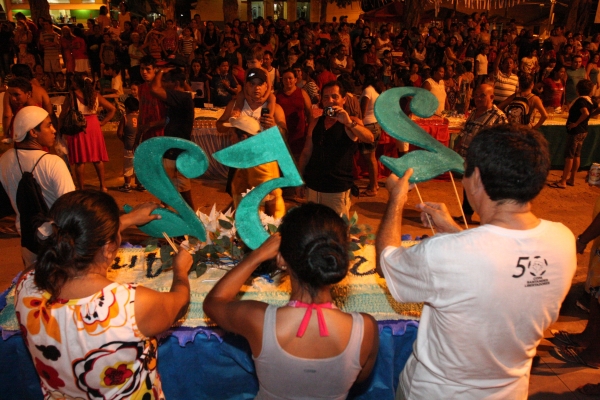 Na praça, a população aguardava a chegada dos bolos, que aos poucos foi tomando forma. Depois da benção ecumênica e entrega de medalhas aos jovens campeões das atividades esportivas, os mais antigos da vila foram chamados para cantar os parabéns a Alter do Chão. O momento mais esperado por todos foi a distribuição do bolo gigante de aniversário aos comunitários e turistas presentes.