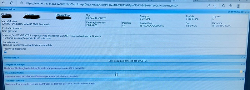 O secretário apresentou à reportagem imagens do sistema do Detran mostrando que não há nenhuma notificação de autuação, multas em aberto e débitos em atraso para o veículo. No sistema da Secretaria Estadual da Fazenda (SEFAZ) também não consta nenhum débito.