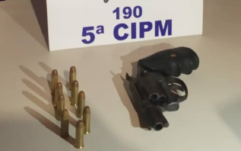 Durante busca pessoal e veicular foram encontradas, uma arma de fogo, nove munições intactas (calibre 38) e um aparelho celular Samsung de cor rosa.