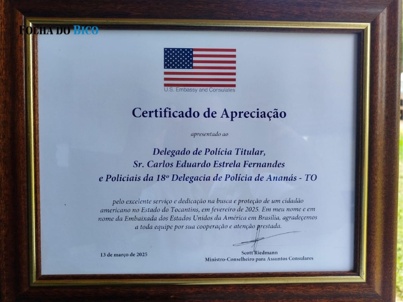 Como forma de reconhecimento pelo relevante serviço policial investigativo que resultou na localização e no resgate de um cidadão norte americano, que era mantido contra sua vontade em uma fazenda na zona rural de Ananás, representantes do governo americano, em solo brasileiro, enviaram à equipe da 18ª Delegacia de Ananás, uma nota de agradecimento e um certificado de apreciação a todos os policiais civis e demais servidores administrativos que participaram da ação realizada no último dia 21 de fevereiro.