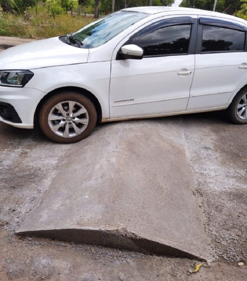 Moradores relatam que durante o final de semana, acidentes sem vítimas fatais, chegaram a ocorrer e que veículos de pequeno porte, tem tido dificuldades de passagem, devido a altura do equipamento.