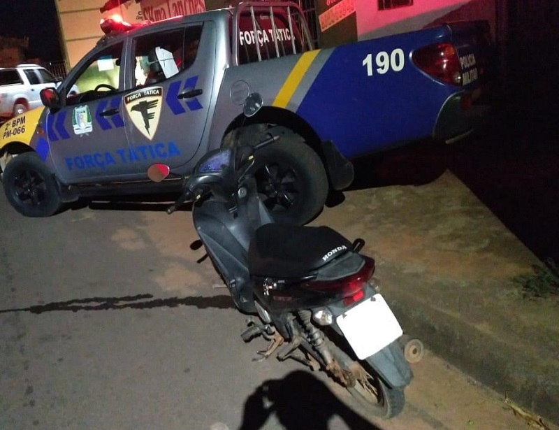 Durante patrulhamento no endereço informado, a equipe de Força Tática avistou dois indivíduos, 16 e 17 anos, em atitude suspeita. Em seguida, foi realizada a abordagem e busca pessoal, momento em que foi encontrado com o adolescente, 17 anos, um simulacro de arma de fogo. Os policiais verificaram no sistema e constataram que a moto Honda Biz 125 de cor preta, que estava sendo conduzida pelo adolescente, 16 anos, estava com ocorrência de furto/roubo referente ao dia 22 de julho deste ano, fato ocorrido no Setor Brasil.