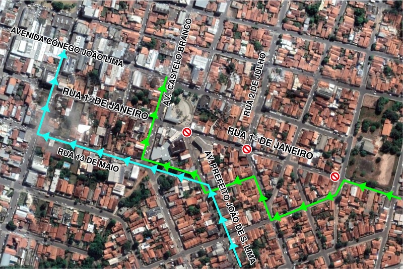 Quem segue pela Av. Prefeito João de Sousa Lima em direção ao Centro precisa fazer o desvio à esquerda na Rua Treze de Maio, podendo virar à direita na Av. Castelo Branco ou na Rua Santa Cruz.