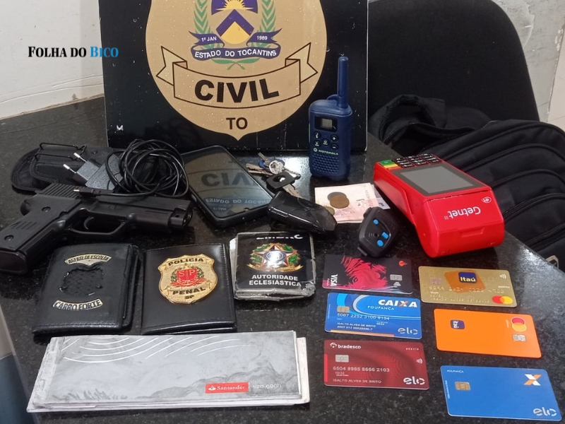 Durante a abordagem, foram apreendidos com o suspeito diversos materiais, incluindo simulacros de arma de fogo, distintivos falsos, talões de cheques e cartões bancários. A ação contou com o apoio do policial civil Francisco Filho Noleto Pinto, que inicialmente suspeitou do golpe após alertas de um amigo envolvido na negociação do imóvel.