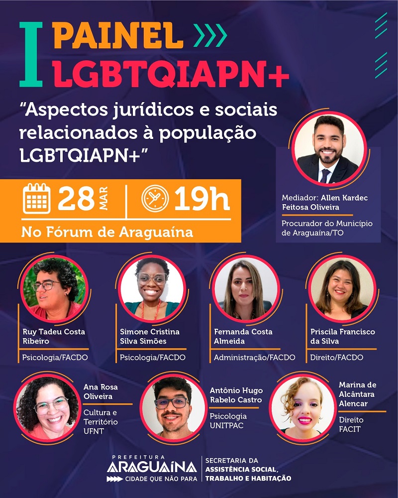A garantia e a promoção de direitos da população LGBTQAPN+ (Lésbicas, Gays, Bissexuais, Transexuais, Queer, Intersexuais, Assexuais, Pansexuais) no Brasil ainda são consideradas um desafio à rede de atendimento socioassistencial, por isso a Prefeitura de Araguaína ampliará o espaço de debates com a realização do Painel de Aspectos Jurídicos e Sociais. O evento será no dia 28 de março, das 19 às 22 horas, no auditório do Fórum de Araguaína, localizado na Avenida Filadélfia. As inscrições estão abertas e as vagas são limitadas.
