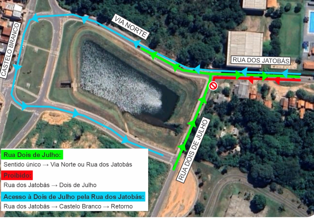 Entre as principais mudanças está a transformação da Rua 2 de Julho, no trecho entre a Via Norte e a Rua dos Jatobás, em via de sentido único. Com isso, condutores terão duas opções ao final da via: seguir pela Via Norte ou acessar a Rua dos Jatobás. A conversão da Rua dos Jatobás para a Rua 2 de Julho estará temporariamente proibida, exigindo rota alternativa pela Rua Castelo Branco.