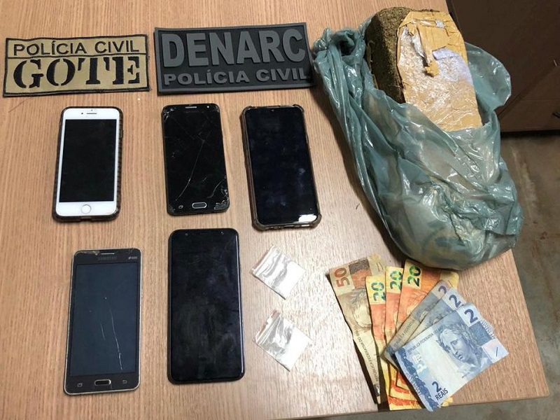 Ao chegar à residência do indivíduo considerado o líder, os policiais tiveram que conter o homem que resistiu à prisão e tentou fugir. Em buscas realizadas no interior da casa, os agentes localizaram e apreenderam uma barra de mais de um quilo de maconha, várias porções de cocaína, já embaladas e prontas para a venda, além de certa quantia em dinheiro.