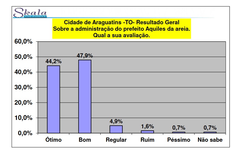 Uma nova pesquisa do Instituto Skala, divulgada esta semana, aponta que se mantém alta, a aprovação da gestão Aquiles da Areia (PP), em Araguatins, maior município do Bico do Papagaio.