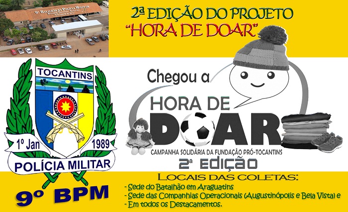 Objetivando o trabalho de ação social frente às famílias e comunidades carentes a Fundação Pró-Tocantins juntamente com a Polícia Militar está desenvolvendo o Projeto “Hora de Doar”. O 9º BPM, o mais novo Batalhão da Polícia Militar do Estado do Tocantins, abraçou a causa e já começou a executar o projeto beneficente.