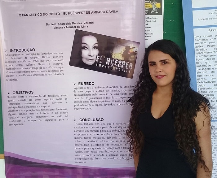 O trabalho, intitulado “O fantástico no conto El huésped, de Amparo Dávila”, teve a orientação da professora Dra Daniele Aparecida Zaratin, apresentado na modalidade pôster, buscou refletir sobre as estratégias de composição do fantástico na mencionada narrativa e pretendeu, também, promover a literatura dessa importante narradora mexicana, autora de uma significativa produção literária e ainda pouco lida em nosso país, inclusive entre os estudantes de Letras.