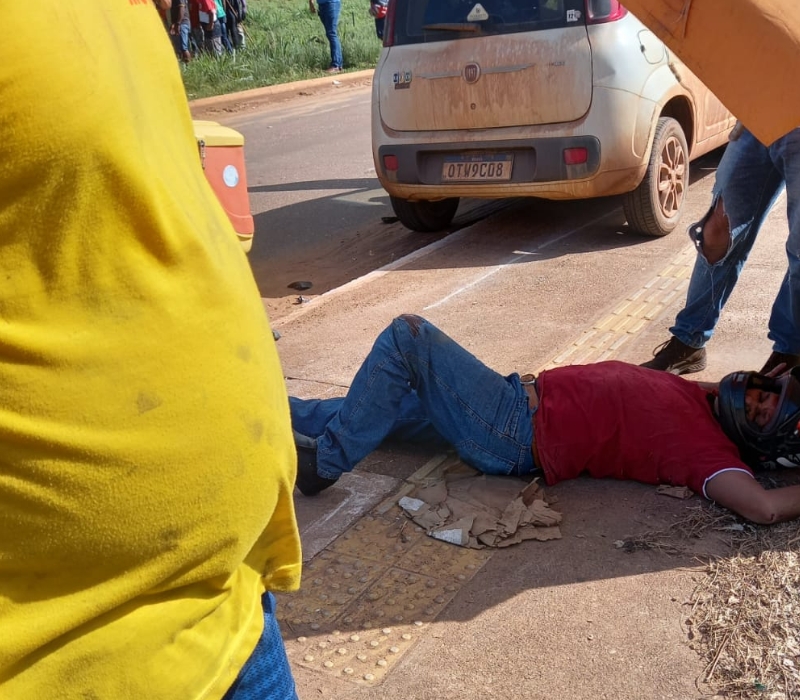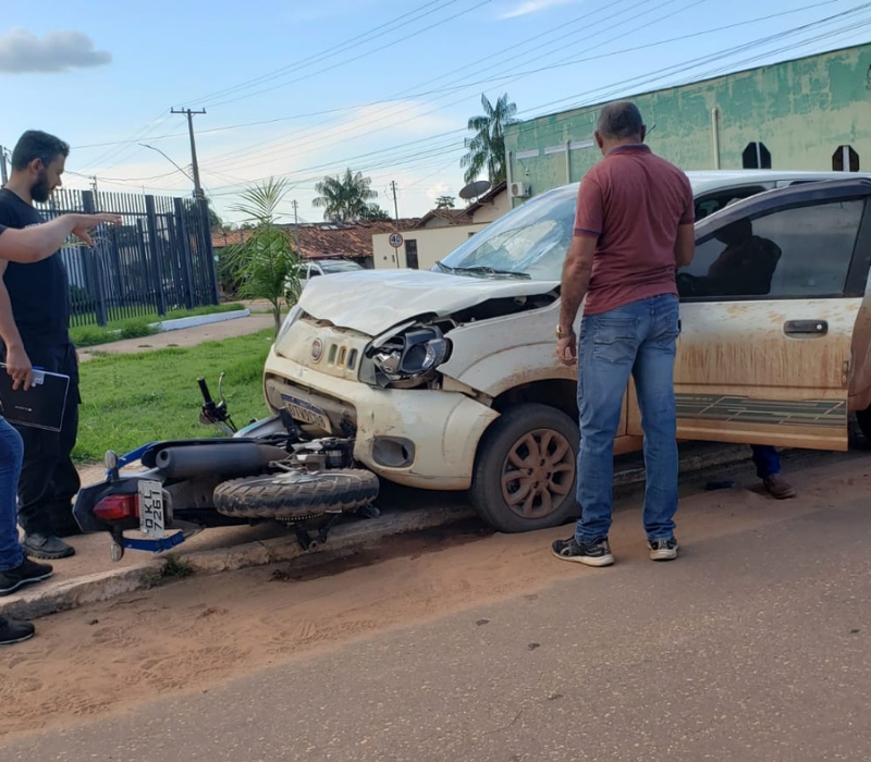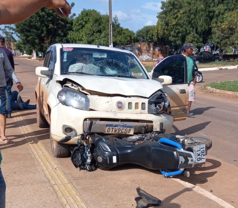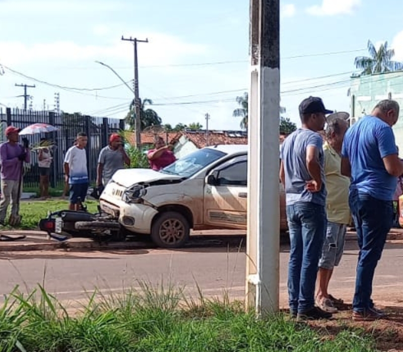 O sinistro envolveu uma moto e um veículo de passeio e aconteceu no cruzamento da Avenida Araguaia com Rua Castelo Branco, no centro.