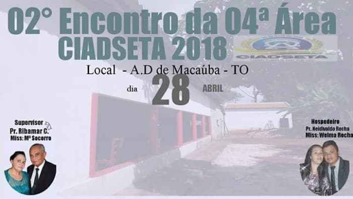A reunião acontecerá na manhã do dia 28 de Abril. Assim o anfitrião, Pastor Neidivaldo de Sousa Rocha, juntamente com a amada Igreja, sentem-se honrados com esta programação e aguardam, todos para o conclave e ao final servirão um delicioso almoço. (Ascom AD Araguatins)