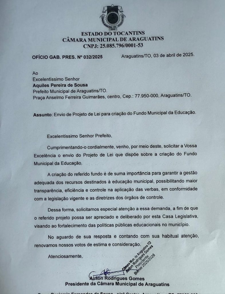Em uma iniciativa voltada para o aprimoramento da gestão educacional, o presidente da Câmara Municipal de Araguatins, vereador Airton Rodrigues (REPU), formalizou um pedido para a elaboração de uma Lei que institua o Fundo Municipal de Educação. A proposta foi encaminhada ao prefeito Aquiles da Areia (PP) e à Secretaria Municipal de Educação, destacando a relevância da medida para o desenvolvimento do setor.