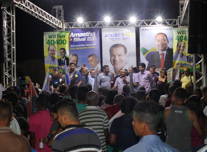 O candidato do PSB ao Governo do Estado pela Coligação A Verdadeira Mudança, Carlos Amastha, comandou comício em Araguatins, no Bico do Papagaio, na noite deste sábado, 29. Ao lado, dele estavam o ex-prefeito, Lindomar Madalena (PSB), o candidato a deputado federal, Marcos da Eticcam (PSDB) e os estaduais Wiston Gomes (PSB), Aparecido da Belina (PRP) e Jair Farias (MDB), todos da região. Outros candidatos de diferentes lugares também compareceram.