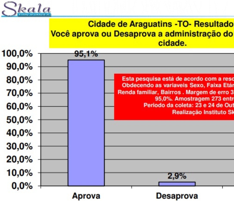 O Instituto Skala realizou uma nova rodada de pesquisa no município de Araguatins, maior da região do Bico do Papagaio, e sondou questões administrativas nas três esferas, bem como eleitorais.