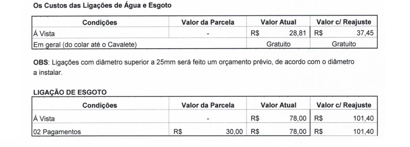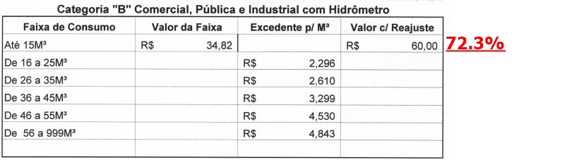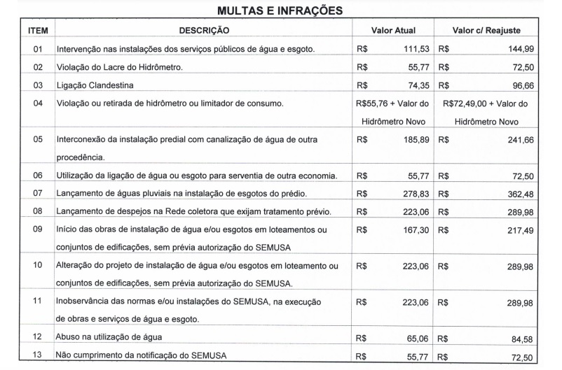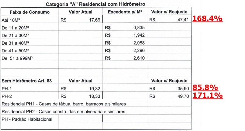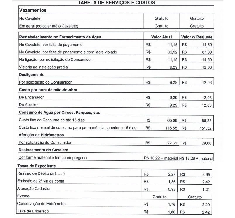 As alegações para a revisão dos valores são: aumento dos custos de manutenção da Estação de Tratamento de Água; expansão da rede; energia elétrica; recuperação de equipamentos; instalação de mais hidrômetros e incrementar melhorias em instalações.
