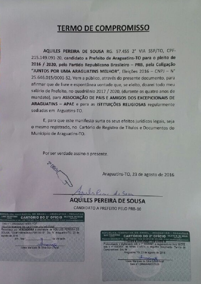 Aquiles surpreendeu ao registrar em cartório um documento em que abre mão de todo o salário como prefeito. No texto, o candidato afirma que doará para a Associação de Pais e Amigos dos Excepcionais (Apae) e entidades religiosas.