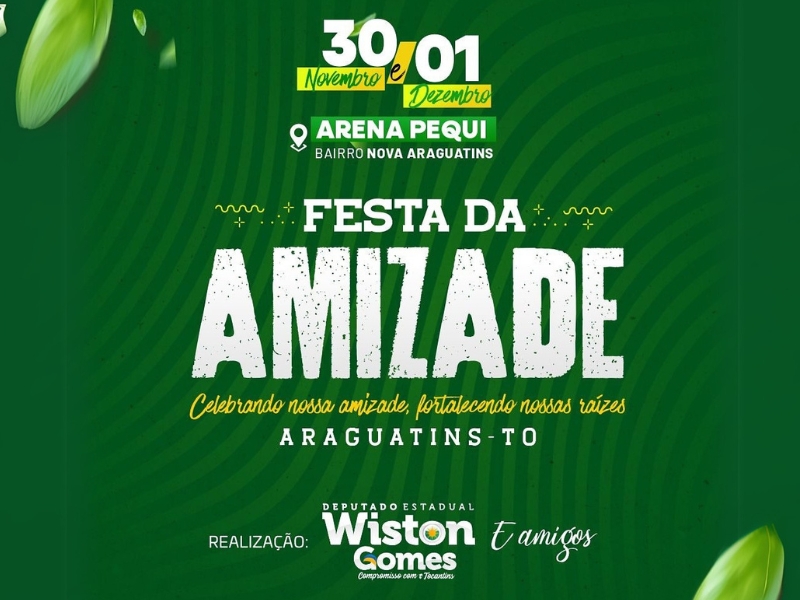 A 3ª Festa da Amizade é uma realização do deputado estadual Wiston Gomes e seus amigos, que reforçam a importância de eventos como este para promover a integração entre os moradores de Araguatins e região. “É um momento para celebrarmos as amizades e fortalecer os laços com a comunidade, oferecendo uma festa de qualidade, totalmente gratuita, e cheia de alegria”, destacou o deputado.