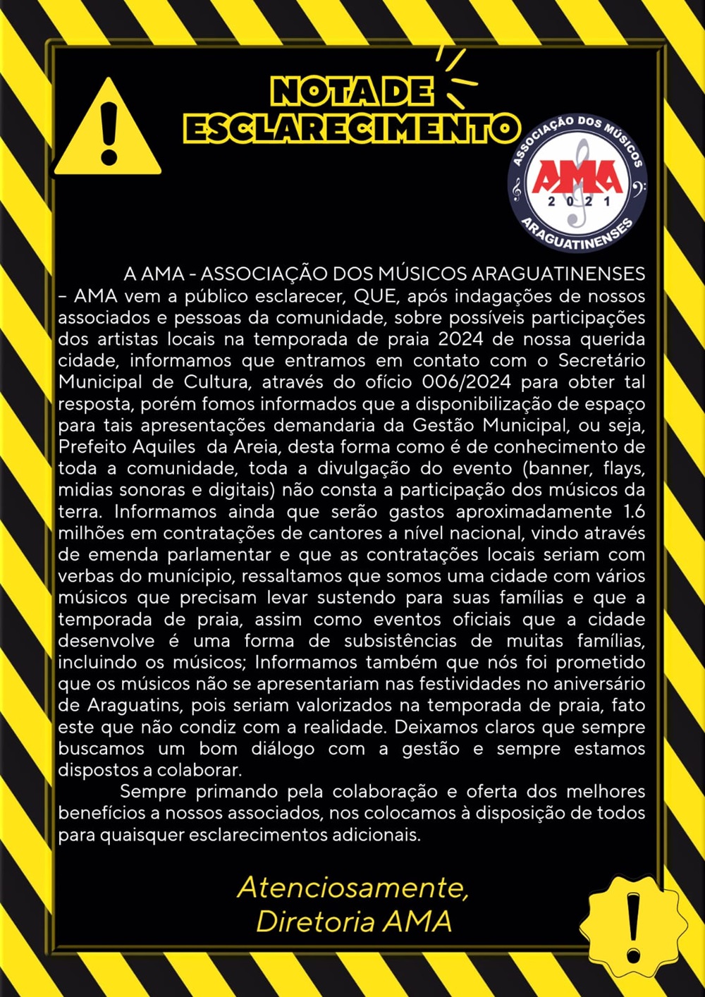 A Associação dos Músicos Araguatinenses (AMA) veio a público esclarecer dúvidas levantadas por seus associados e membros da comunidade sobre a participação dos artistas locais na temporada de praia 2024. A AMA informou que entrou em contato com o secretário municipal de Cultura através do ofício 006/2024 para obter respostas, mas foi notificada de que a disponibilização de espaço para apresentações depende da Gestão Municipal, liderada pelo prefeito Aquiles da Areia.