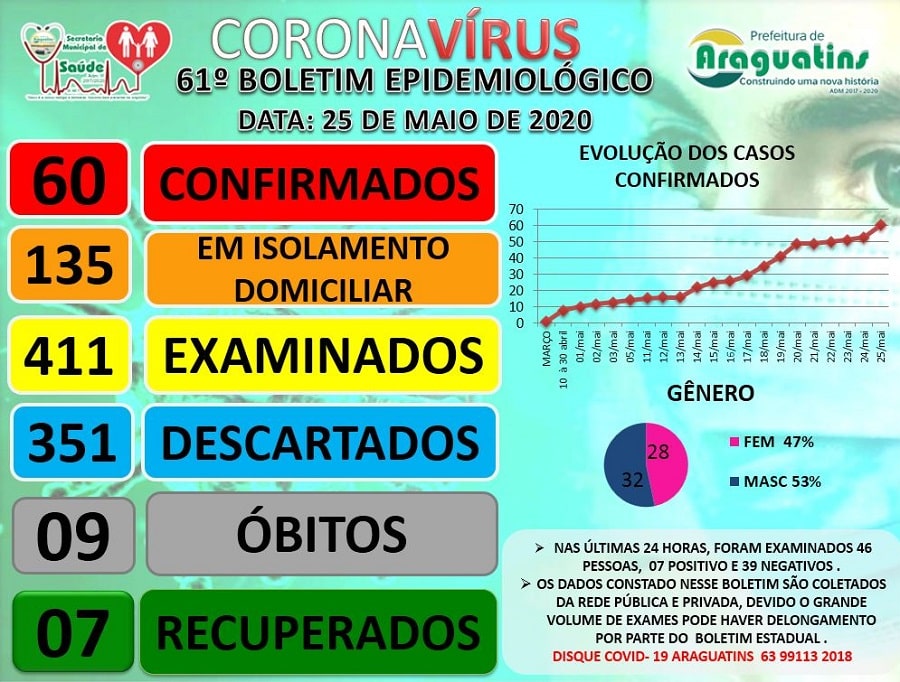Desta forma, Araguatins sobe para 60 testados positivos para Covid-19, com 7 já recuperados. 135 pacientes estão em isolamento domiciliar.