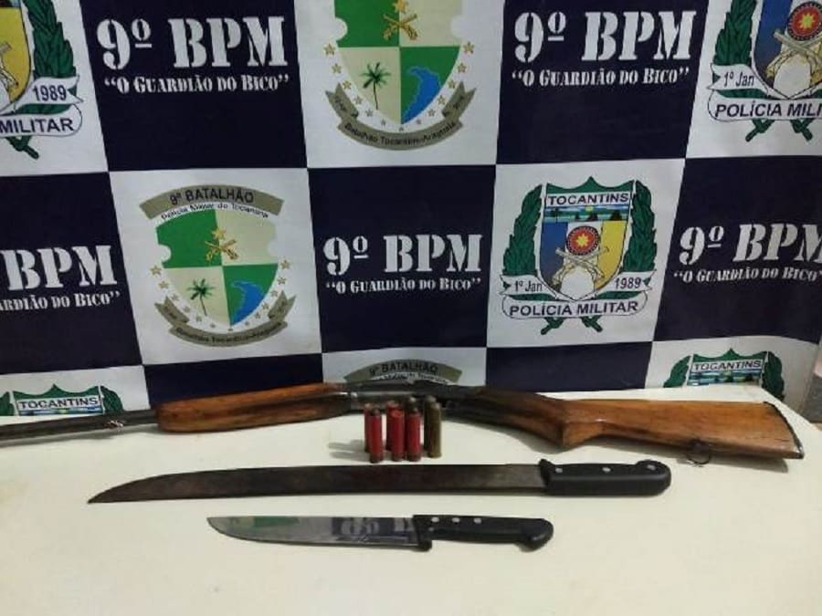 Equipe de policiais militares do 9º Batalhão da PM (9º BPM) apreendeu na tarde de quarta-feira, 17, em Araguatins, no Bico do Papagaio, uma espingarda cartucheira calibre 32 com oito cartuchos intactos do mesmo calibre, um facão e uma faca. Os objetos foram localizados no interior de um veículo GM Celta, placa de Augustinópolis-TO, conduzido por um homem de 31 anos que acabou preso.