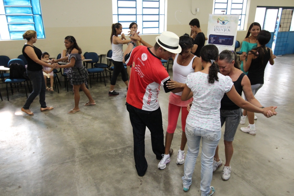 Com o clássico ‘pé esquerdo para frente e pé direito para trás’, o professor de dança Serginho Moreira começou sua aula na oficina de dança de salão no Colégio Leonidas Gonçalves Duarte, na manhã desta sexta-feira, 26. A oficina integra a programação cultural promovida pelo Circuito de Eventos Tradicionais do Tocantins, promovido pela Fundação Cultural do Tocantins e Ministério da Cultura, com carga horária de 20 horas.
