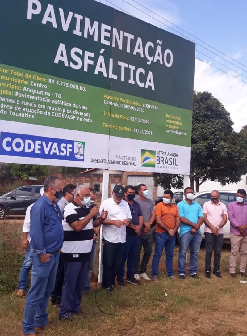O Governo Federal, por meio da Companhia de Desenvolvimento dos Vales do São Francisco e do Parnaíba (CODEVASF), investirá R$ 4,7 milhões em obras de pavimentação de ruas em Araguatins, no Bico do Papagaio. A placa com o detalhamento do serviço para o início dos trabalhos foi colocada nesta terça, 15, pelo representante CODEVASF, Homero Barreto, acompanhado de autoridades do município.