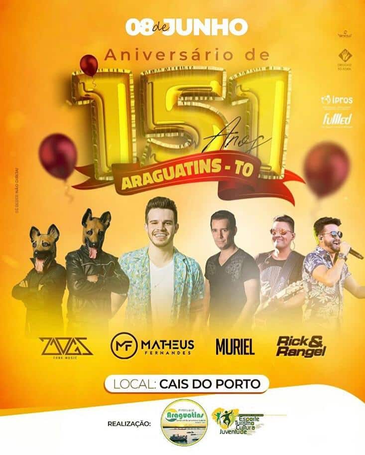 Araguatins completa no próximo dia 9 de junho, 151 de história e para comemorar, a Prefeitura Municipal prepara uma festa com atividades artísticas, culturais e cívicas. A programação completa ainda não foi divulgada oficialmente, mas as atrações artísticas realizarão os shows no sábado, 8, na virada para o dia do aniversário, e os artistas que animaram a população na festa já estão agendadas.