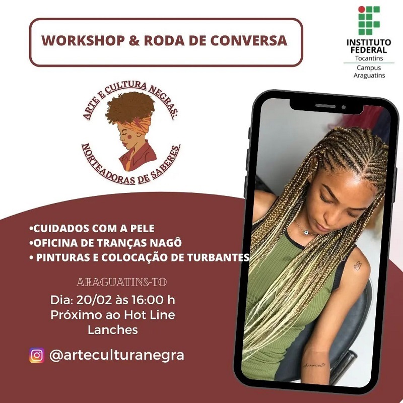 Provocar reflexões e oferecer informações que geram conhecimento sobre a cultura negra, esses são alguns dos objetivos do projeto de extensão, “Arte e cultura negra: norteadoras de saberes” executado pela Unidade de Araguatins do IFTO, na cidade de Araguatins. No dia 20 de fevereiro (domingo), será a vez do Cais do Porto de Araguatins, próximo ao Hot line, receber uma programação especial do projeto, que consistirá na realização de um Workshop e uma roda de conversa, a partir das 16h.