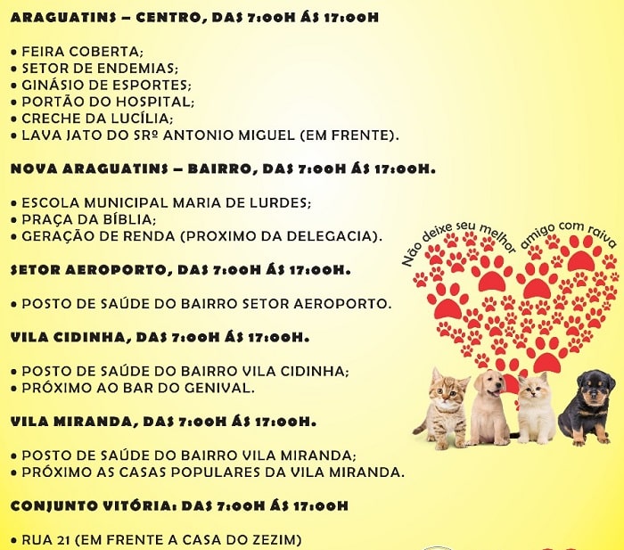 O Dia D da campanha de vacinação antirrábica será neste sábado, 7, das 8 às 17 horas, em Araguatins.