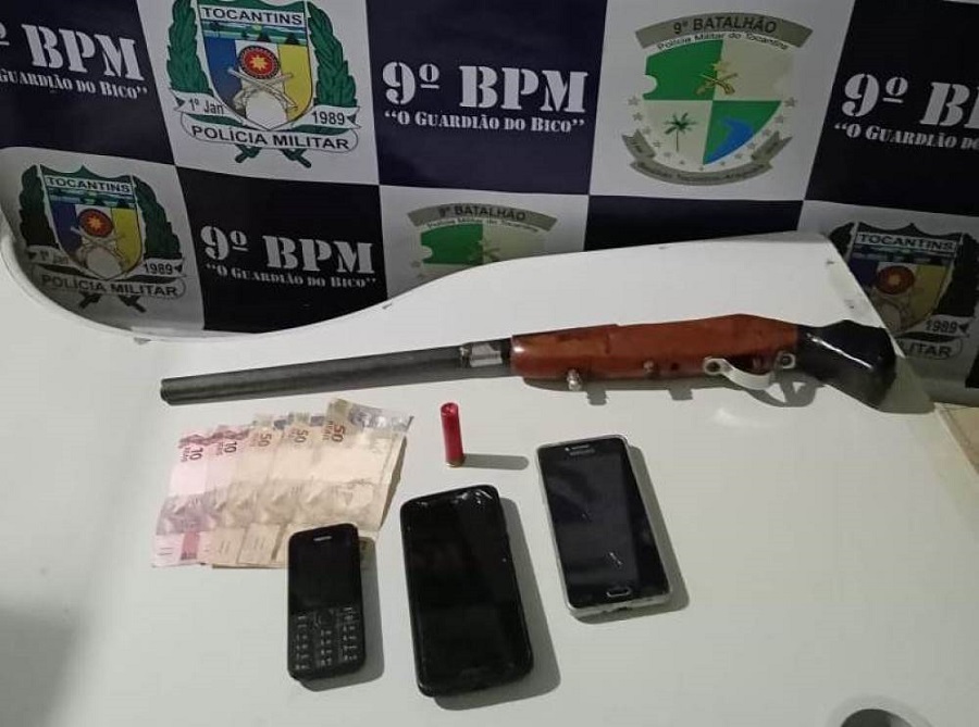 A Polícia Militar prendeu na noite de terça-feira, 04, dois homens, 19 e 27 anos, suspeitos de roubarem um taxista de 44 anos no Bairro Irial, em Araguatins, no Bico do Papagaio. Em poder do indivíduo de 27 anos a PM apreendeu uma arma de fogo artesanal tipo espingarda, calibre 32, com um cartucho intacto, três aparelhos celulares e uma quantia no valor de R$ 170,00 em espécie.