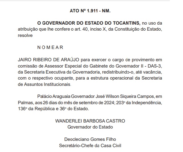 Jairo agora vai exercer o cargo de provimento em comissão de assessor especial do Gabinete do Governador II – DAS-3, na Secretaria de Assuntos Institucionais do Governo do Tocantins. Ele não quis disputar a reeleição.
