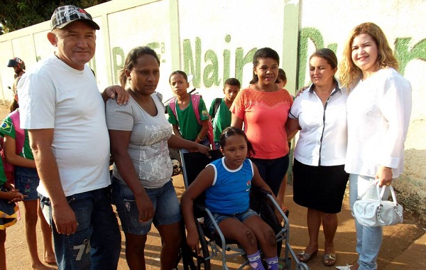 Na manhã desta quinta-feira, 21, que assinalou o inicio da Semana de Prevenção às Deficiências, um gesto de solidariedade marcou o dia da pequena Vitória da Silva Cardoso, de apenas 10 anos. A garota recebeu da empresária Nalva Pereira, proprietária da empresa Clínica de Estética, a doação de uma cadeira de rodas.