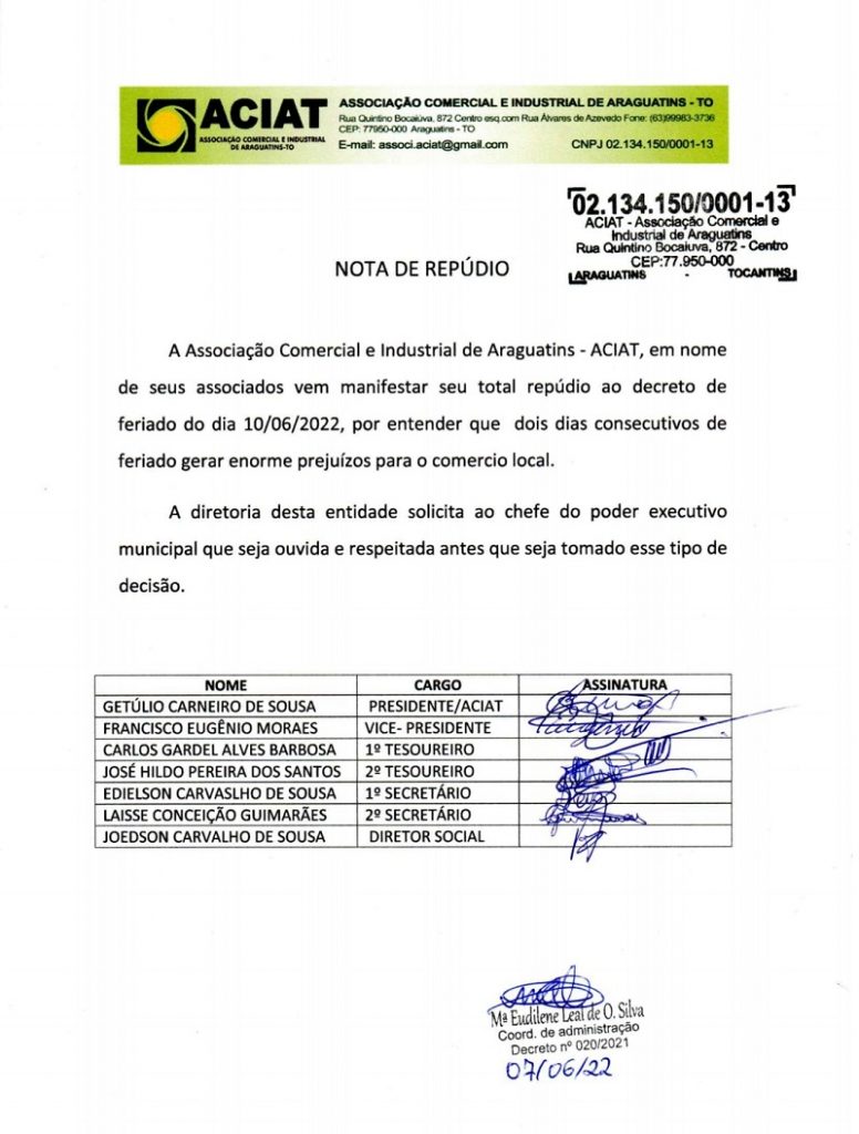 A Associação Comercial e Industrial de Araguatins (ACIAT) manifestou em nome de seus associados, total repúdio ao decreto de feriado para esta sexta-feira, 10, emendando com o feriado de quinta-feira, 9, dia no aniversário do município.