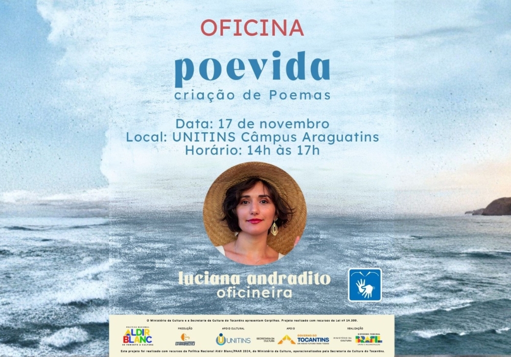 A Secult ampliou as ações de formação literária no Bico do Papagaio com a abertura das inscrições para a oficina Poevida – Criação de Poemas, que será realizada no dia 17 de novembro, das 14h às 17h, no Câmpus Araguatins da Unitins. A atividade será conduzida pela escritora Luciana Andradito e integra o projeto de lançamento do livro Corpilhas, produzido com recursos da Política Nacional Aldir Blanc (PNAB). A iniciativa busca aproximar a comunidade da criação literária e fortalecer o circuito cultural regional.