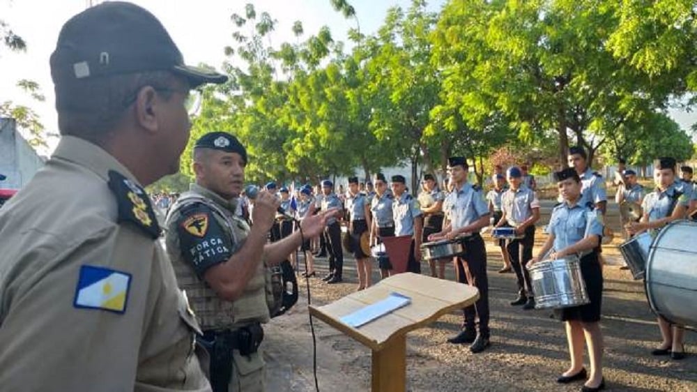Policiais militares integrantes da equipe de Força Tática (FT) do 9º Batalhão da PM estiveram na manhã dessa quarta-feira, 11, no Colégio da Polícia Militar (CPM) Unidade VI em Araguatins, atendendo convite formulado pelo gestor da unidade escolar, tenente-coronel Márcio Cardoso Almeida, para a realização de uma palestra aos alunos do CPM sobre a carreira e as atribuições do policial militar componente de Força Tática da Polícia Militar (PM).
